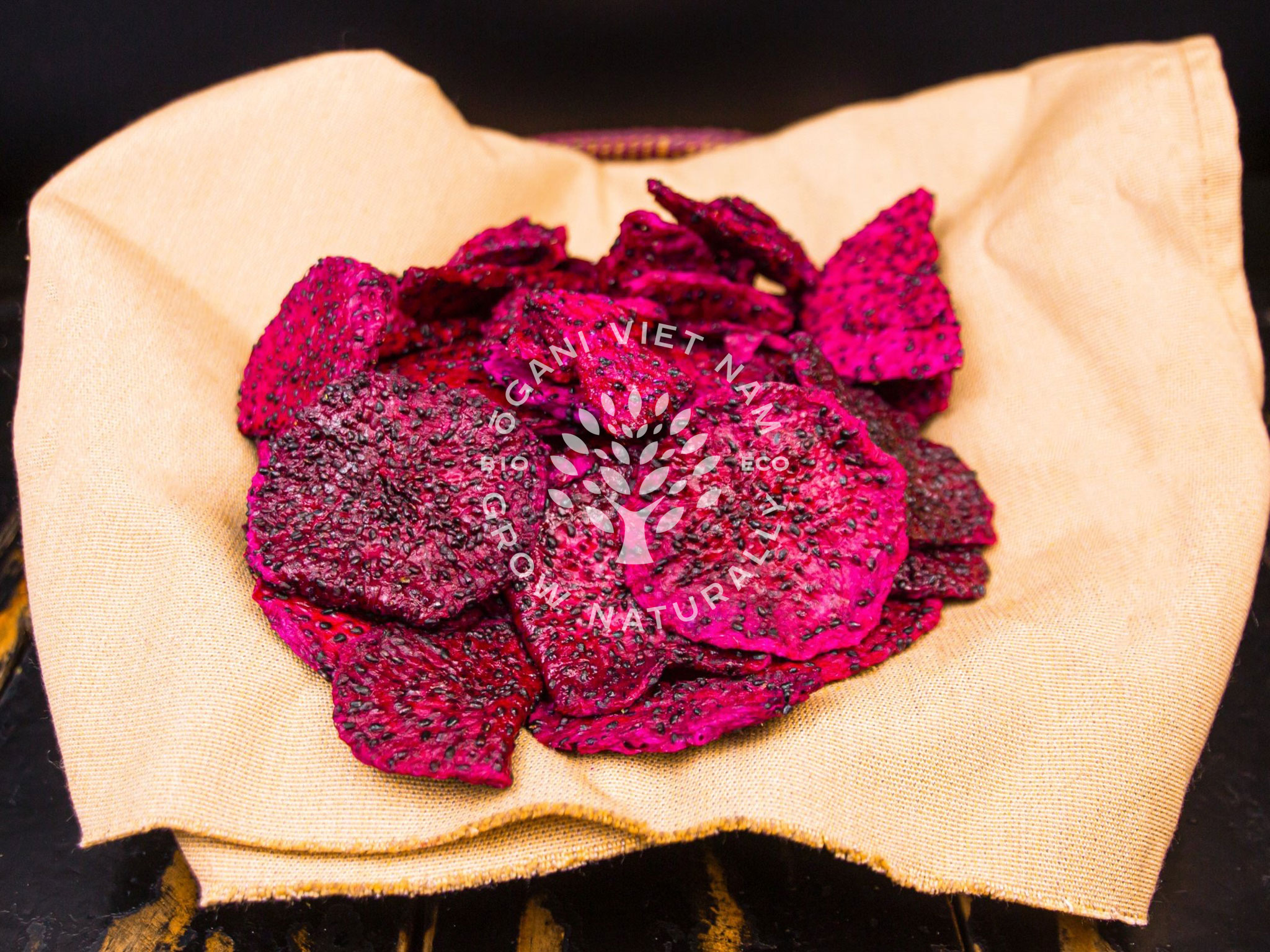 Dried red dragon fruit comes from a cactus. The plant grows in hot places. People harvest the fruit when the outside turns bright pink. They peel away the thick skin. Inside sits the treasure – flesh the color of sunset.
