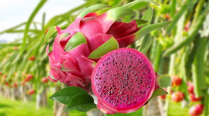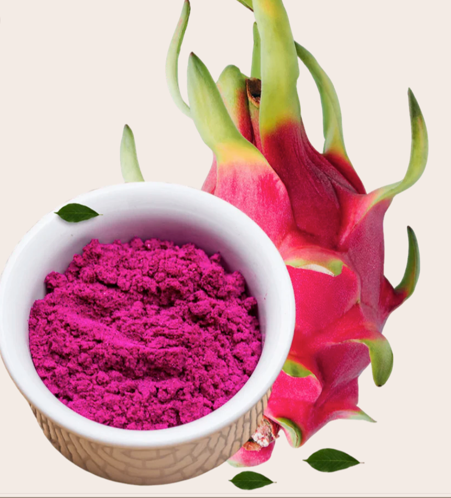 The powder comes from red dragon fruit flesh. Scientists call it Hylocereus polyrhizus. The fruit grows on night-blooming cactus plants. Farmers harvest it when perfectly ripe.